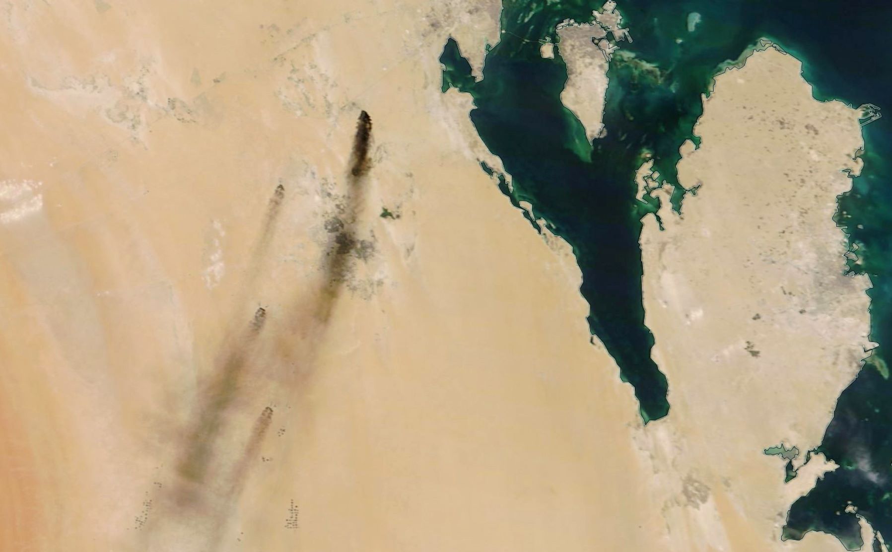 (Arabia Saudita), 14/09 / 2019.- Una foto del folleto puesta a disposición por la NASA Worldview muestra una imagen satelital de humo de incendios en dos grandes instalaciones petroleras en el este de Arabia Saudita, 14 de septiembre de 2019 (emitida el 15 de septiembre de 2019), después de la supuesta ataques con aviones no tripulados reclamados por los rebeldes hutíes de Yemen. Según la empresa petrolera estatal saudita Aramco, dos de sus instalaciones petroleras en Arabia Saudita, Khurais y Abqaiq, fueron incendiadas el 14 de septiembre después de que supuestamente habían sido blanco de ataques con aviones no tripulados. En la imagen se ve Bahrein (isla, arriba) y Qatar. EFE / EPA / NASA WORLDVIEW