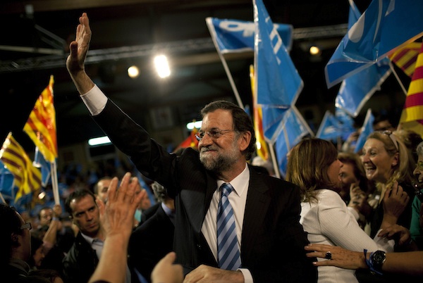 El candidato a presidente por el Partido Popular, Mariano Rajoy, saluda a partidarios durante un acto de campaña en Hospitalet, en las afueras de Barcelona, el miércoles 16 de noviembre de 2011, con vistas a los comicios generales del domingo en España. (AP foto/Emilio Morenatti)