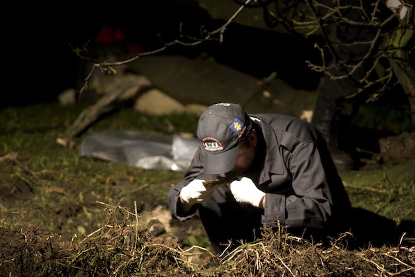 Un forense inspecciona el lugar donde explotó un pequeño artefacto cerca de la Embajada estadounidense en Bogotá, viernes 13 de abril de 2012. No se reportaron vÃctimas ni daños. Mandatarios de las Américas se encuentran en Cartagena para la VI Cumbre de las Américas. (AP Foto/William Fernando Martinez)