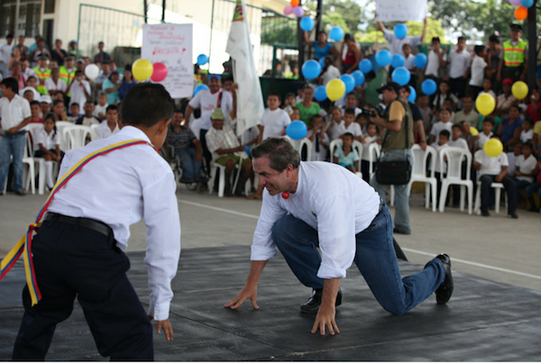 El Canciller Ricardo Patiño se ha parado de cabeza en Puerto Nuevo, provincia de Sucumbíos, hasta donde ha llegado el sábado 2 de junio, junto con el Viceministro de Relaciones Exteriores e Integración Política, Marco Albuja, para rendir homenaje a los niños y niñas del Centro Educativo “Carlos Azuero Añazco” y de las escuelas “José Mejía Lequerica” y “Carlos Concha Torres”, a propósito del Día Internacional de Niño.