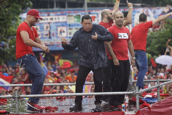 El presidente de Venezuela Hugo Chávez, segundo desde la derecha, baila luego de pronunciar un discurso durante un acto de su cierre de campaña presidencial en Caracas, Venezuela, el jueves 4 de octubre de 2012. Los venezolanos acuden a las urnas el domingo con Chávez en busca de la reelección frente al candidato opositor Henrique Capriles. (AP Photo/Ariana Cubillos)