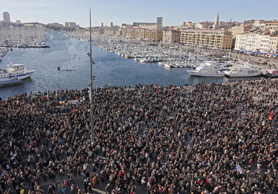 Las protestas de hoy en varias provincias francesas se desarrollaron por lo general en silencio, muchas veces acompañadas por carteles en los que se leía «Todos somos Charlie», en homenaje a los doce muertos en el atentado de París, el primero de una ola inédita de ataques que han sobrecogido a Francia.