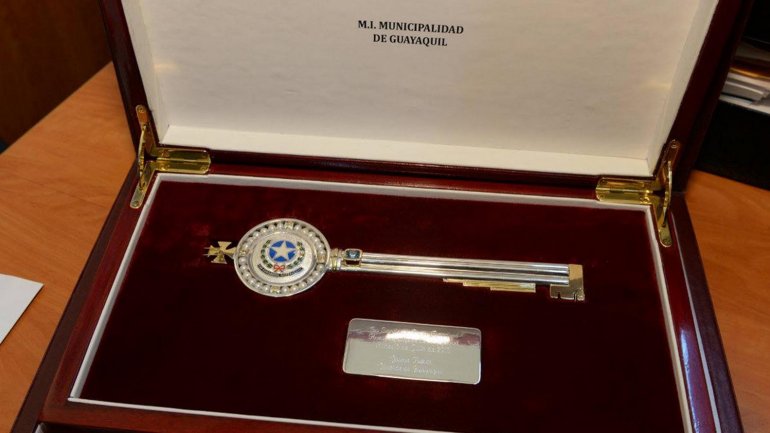 De acuerdo a El Universo, la joya, elaborada por la Joyería Marthita, será entregada al Sumo Pontífice durante el saludo del alcalde Jaime Nebot al papa Francisco durante su arribo a la terminal de la Base Aérea. En dicho encuentro, Francisco será declarado huésped de honor de Guayaquil.