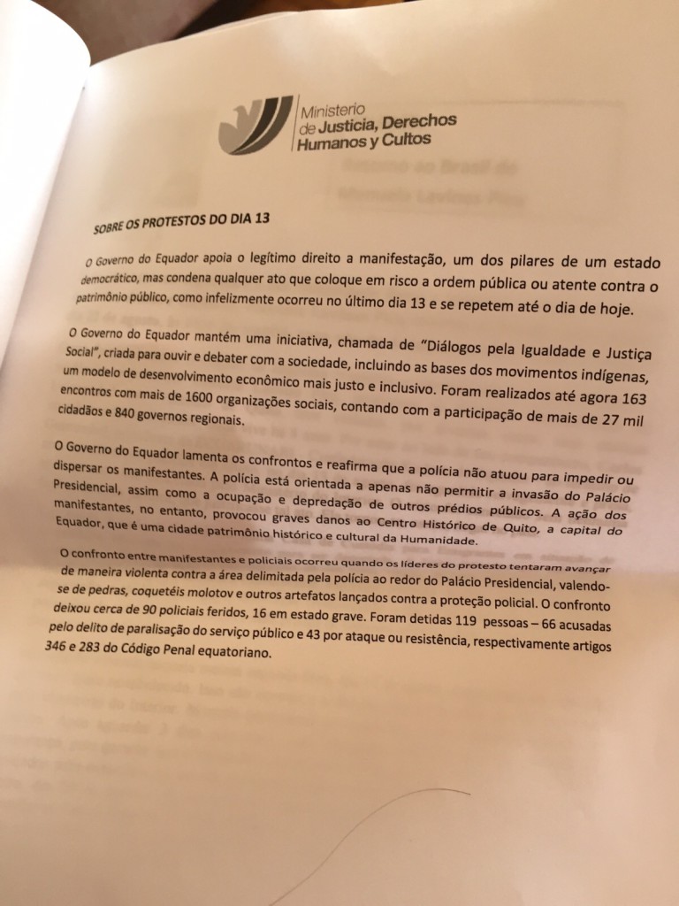 El gobierno del Ecuador ha asegurado a la prensa brasilera que respeta las manifestaciones pacíficas, pero que condena actos que ponen en riesgo el orden público y el patrimonio. A criterio del gobierno la policía nacional nunca impidió las protestas pero que los manifestantes fueron violentos.