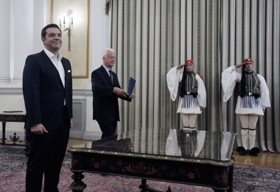 El líder del izquierdista Syriza, Alexis Tsipras (izda), se dispone a jurar su cargo como nuevo primer ministro ante el presidente de la República, Prokopis Pavlópulos (fuera de la imagen), en el palacio presidencial de Atenas, Grecia, el 21 de septiembre del 2015. EFE/Yannis Kolesidis