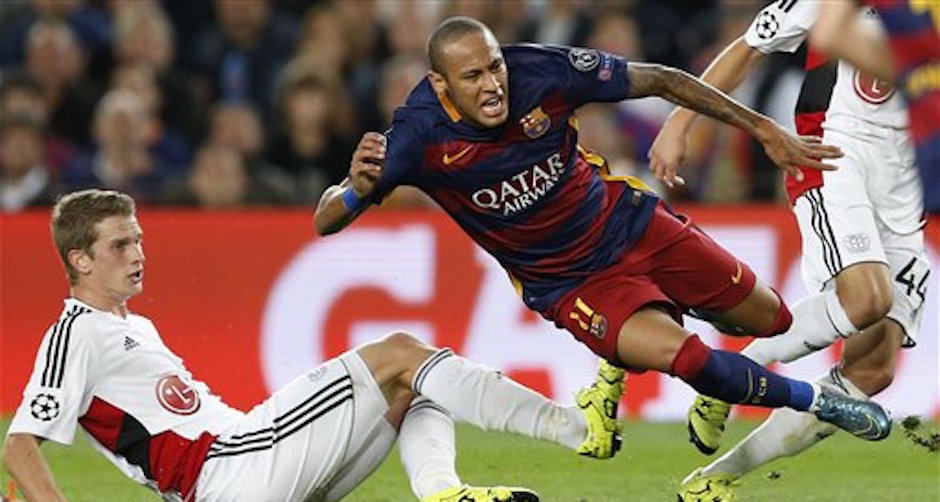 El delantero brasileÒo Neymar del Barcelona cae al disputar un balÛn con Lars Bender del Bayer Leverkusen en el partido por la Liga de Campeones, el martes 29 de septiembre de 2015. (AP Foto/Manu Fernandez)
