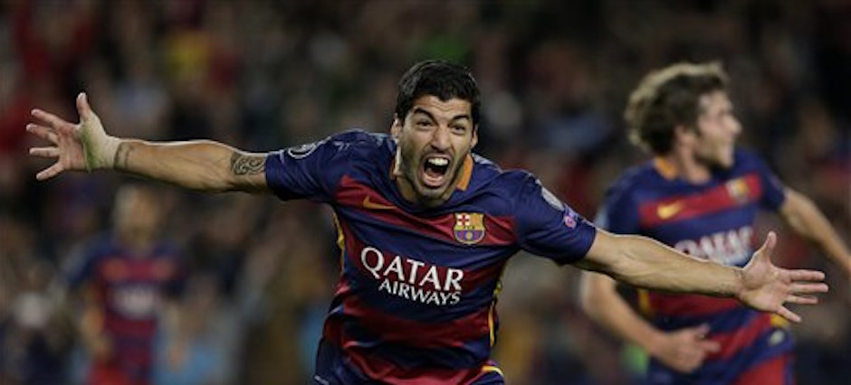 Luis Su·rez celebra tras anotar el gol que le dio al Barcelona la victoria 2-1 ante Bayer Leverkusen en la Liga de Campeones, el martes 29 de septiembre de 2015. (AP Foto/Emilio Morenatti)