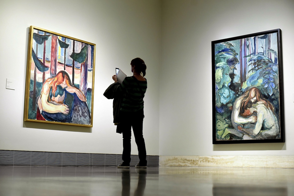 MADRID, 05/10/2015.- Una mujer observa la obra «Mujer vampiro en el bosque» (1916-18), de Edvard Munch, perteneciente a la exposición «Arquetipos», que hoy presenta el Museo Thyssen, la primera muestra sobre el noruego que se hace en Madrid desde 1984. EFE/Fernando Villar