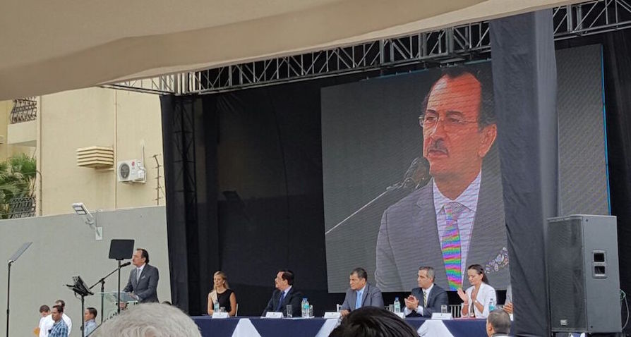 El presidente Rafael Correa junto al alcalde Jaime Nebot durante el acto de inauguración del nuevo edificio de la Contraloría, en Guayaquil, el jueves 8 de octubre de 2015. Foto: LaRepública
