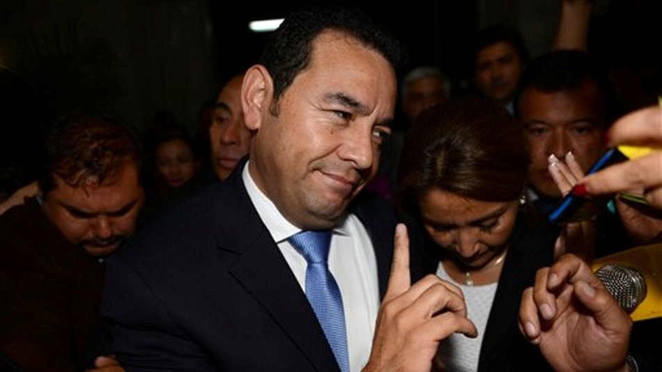ARCHIVO Jimmy Morales, Presidente de Guatemala por el Frente Nacional de Convergencia, habla con reporteros a su llegada a la sede del Tribunal Supremo electoral en la ciudad de Guatemala, el 25 de octubre de 2015. Morales, cómico de televisión, fue elegido próximo presidente de Guatemala aprovechando una ola de ira popular contra la clase política luego de que protestas anticorrupción ayudaran a derrocar al último gobierno. (Foto AP/Oliver de Ros)