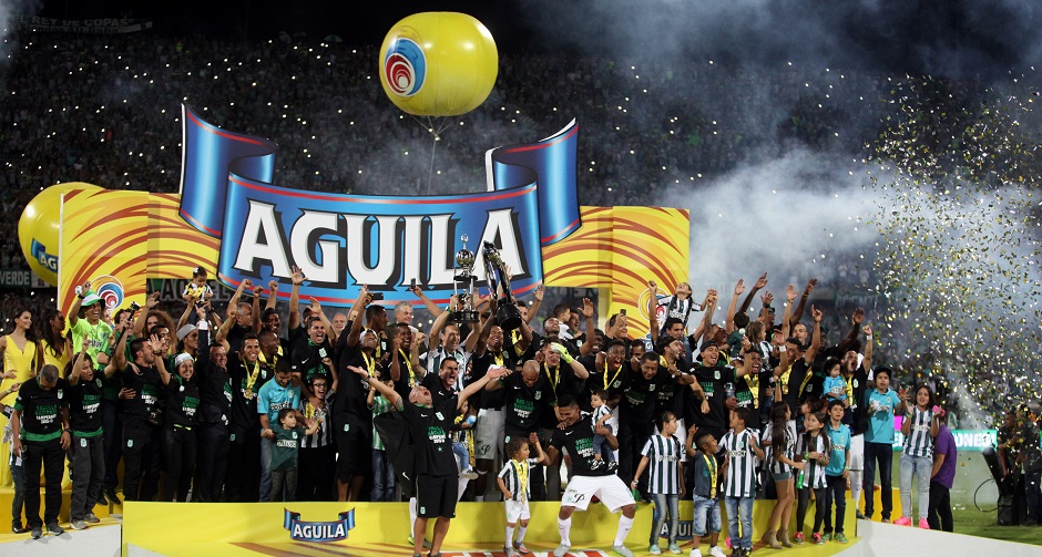 Jugadores de Atlético Nacional celebran la victoria ante Junior hoy, domingo 20 de diciembre de 2015, durante el partido por la final de la liga colombiana de fútbol, en el estadio Atanasio Girardot de Medellín (Colombia). EFE/Luis Eduardo Noriega A.
