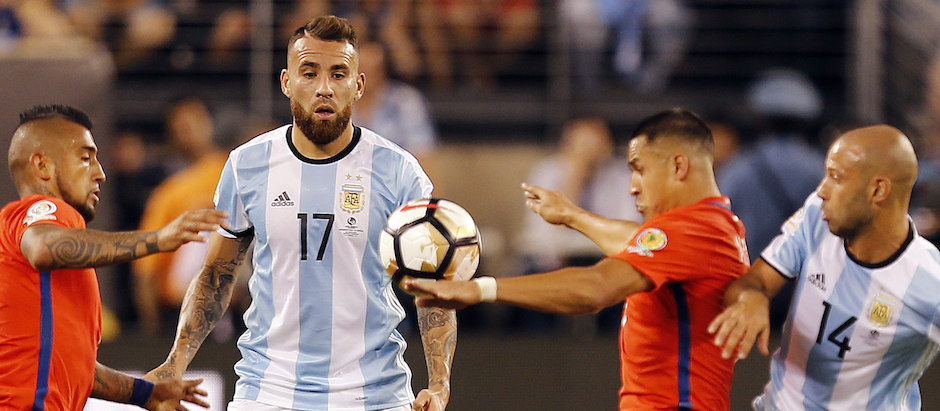 BOG144. EAST RUTHERFORD, (NJ, EE.UU.), 26/06/2016.- Nicolás Otamendi (2i) y Javier Mascherano (d) de Argentina disputan el balón con Arturo Vidal (i) y Alexis Sánchez (2d) de Chile hoy, domingo 26 de junio de 2016, en la final entre Argentina y Chile por la Copa América Centenario en el estadio MetLife de East Rutherford, Nueva Jersey (EE.UU.). EFE/MAURICIO DUEÑAS CASTAÑEDA