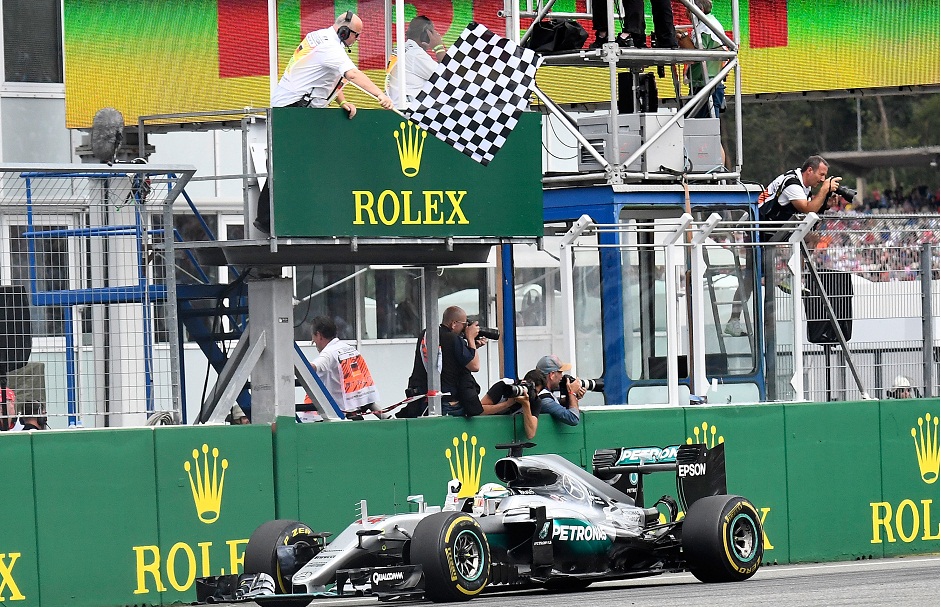 El británico Lewis Hamilton, con Mercedes, recibe la bandera a cuadros al cruzar la meta del Gran Premio de Alemania de Fórmula Uno en Hockenheim, Alemania, domingo 31 de julio de 2016. (AP Foto/Jens Meyer)