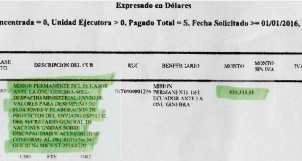 La descripción del CUR dice de forma textual: “Misión permanente del Ecuador ante la ONU Ginebra-envío de valores para desempeño de funciones y elaboración de proyectos del enviado especial del Secretario General de Naciones Unidas Lenín Moreno”. Los documentos establecen que en 2015 recibió $533,333. Al año siguiente, en el mes de enero, Moreno recibió una partida similar –solo varió 33 centavos de dólar- para el desempeño de sus funciones.