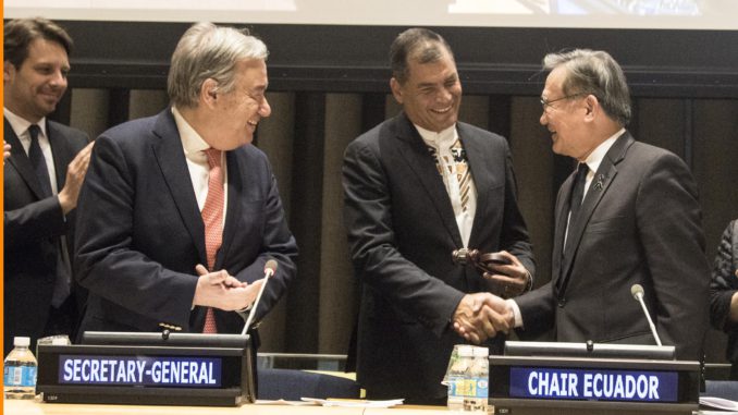 El presidente ecuatoriano asistió a la ceremonia de traspaso anual de la presidencia de ese bloque en un acto en la sede de Naciones Unidas en el que también intervino el secretario general de la ONU, António Guterres.