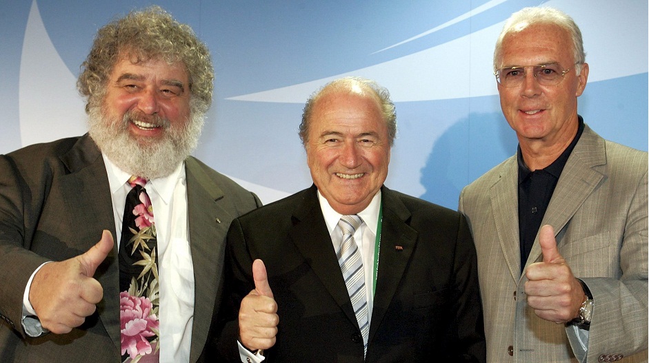 FRÁNCFORT (ALEMANIA) 13/07/2017.- Foto de archivo del presidente del comité de organización de la Copa Confederaciones FIFA 2005, Chuck Blazer (izq), el presidente de la FIFA, Joseph Blatter (c), y el presidente del comité alemán de organización, Franz Beckenbauer, mientras posan para los periodistas en Fráncfort (Alemania) el 27 de junio de 2005. Charles Gordon Blazer, o Chuck Blazer falleció ayer, 12 de julio de 2017, a los 72 años, informó The New York Times. EFE/Frank May
