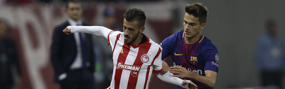 PIRAEUS (GRECIA), 31/10/2017.- Denis Suárez (d) de FC Barcelona disputa un balón con Diogo Figueiras (i) de Olympiacos hoy, martes 31 de octubre de 2017, durante un partido del grupo D de la Liga de Campeones entre Olympiacos Piraeus y FC Barcelona, en el estadio Georgios Karaiskakis en Piraeus (Grecia). EFE/YANNIS KOLESIDIS