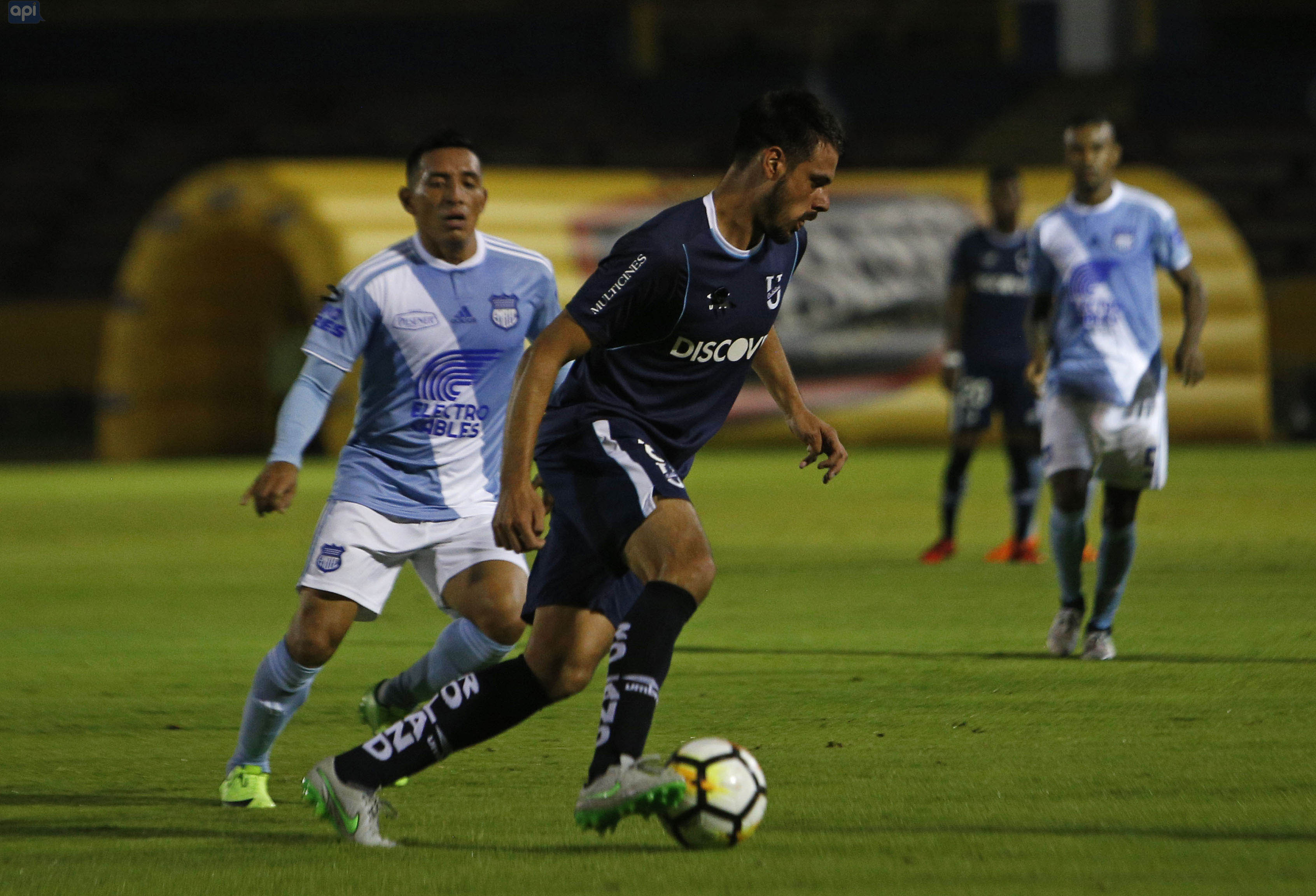 _MG_3432_0 Guillermo de los Santos, jugador de U. Católica domina el balón ante la marca de Holger Matamoros, jugador de Emelec. Foto/API
