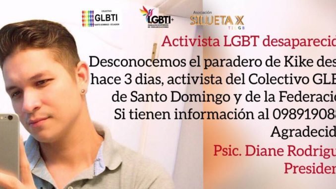 El activista gay de 25 años identificado como Marco Palomino, de Santo Domingo y desaparecido el domingo, fue localizado con vida y aparentemente sedado, informó hoy la presidenta de la Federación Ecuatoriana de Organizaciones LGTBI, Diane Rodríguez.