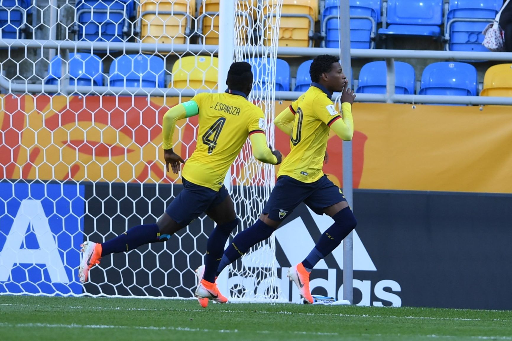 Gonzalo Plata (d) de Ecuador celebra su anotación hoy, miércoles, en un partido de la fase de grupos ante el seleccionado de México por la Copa Mundial Sub’20 en el estadio Gosir en Gdynia (Polonia). EFE/ Adam Warzawa