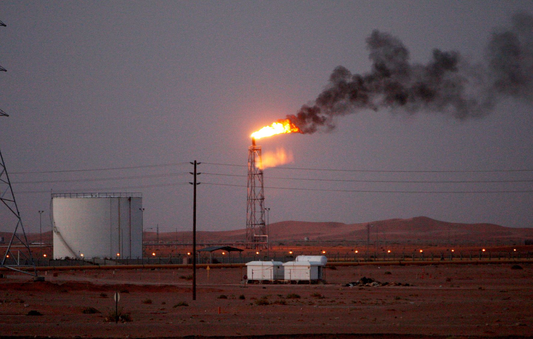 Una llama de gas detrás de las tuberías en el desierto en el campo petrolero Khurais, a unos 160 km de Riad, Reino de Arabia Saudita, 23 de junio de 2008 (reeditado el 14 de septiembre de 2019). Según la compañía petrolera estatal saudita Aramco, dos de sus instalaciones petroleras en Arabia Saudita, Khurais y Abqaiq, fueron incendiadas después de presuntamente haber sido blanco de ataques con aviones no tripulados. EFE / EPA / ALI HAIDER