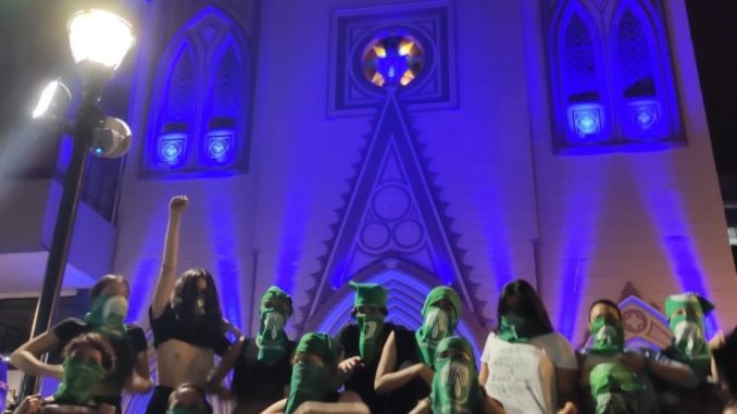 Un colectivo de mujeres abortistas ha protestado en la plaza de La Merced, en el centro de Guayaquil, encapuchados y mostrando los senos en una fotografía que tiene como fondo la icónica iglesia de La Merced.
