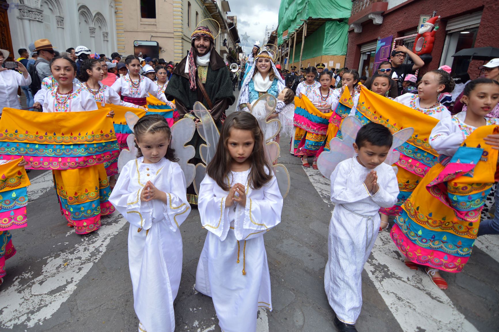 Niños y adultos se disfrazan en Cuenca, el 24 de diciembre de 2019, para acompañar el Pases del Niño Viajero, una devoción que se celebra anualmente al sur de Ecuador. Cono parte de la tradición, el Arzobispo de Cuenca, Monseñor Marcos Pérez Caicedo entregó una imagen del Divino Niño Jesús al Coronel de la Policía Nacional, Mario Castro, como inicio de la gran pasada del Niño Viajero, que recorrió la calle Bolívar desde el parque de San Sebastián hasta el Parque Calderón, en la capital del Azuay. API/Boris Romoleroux