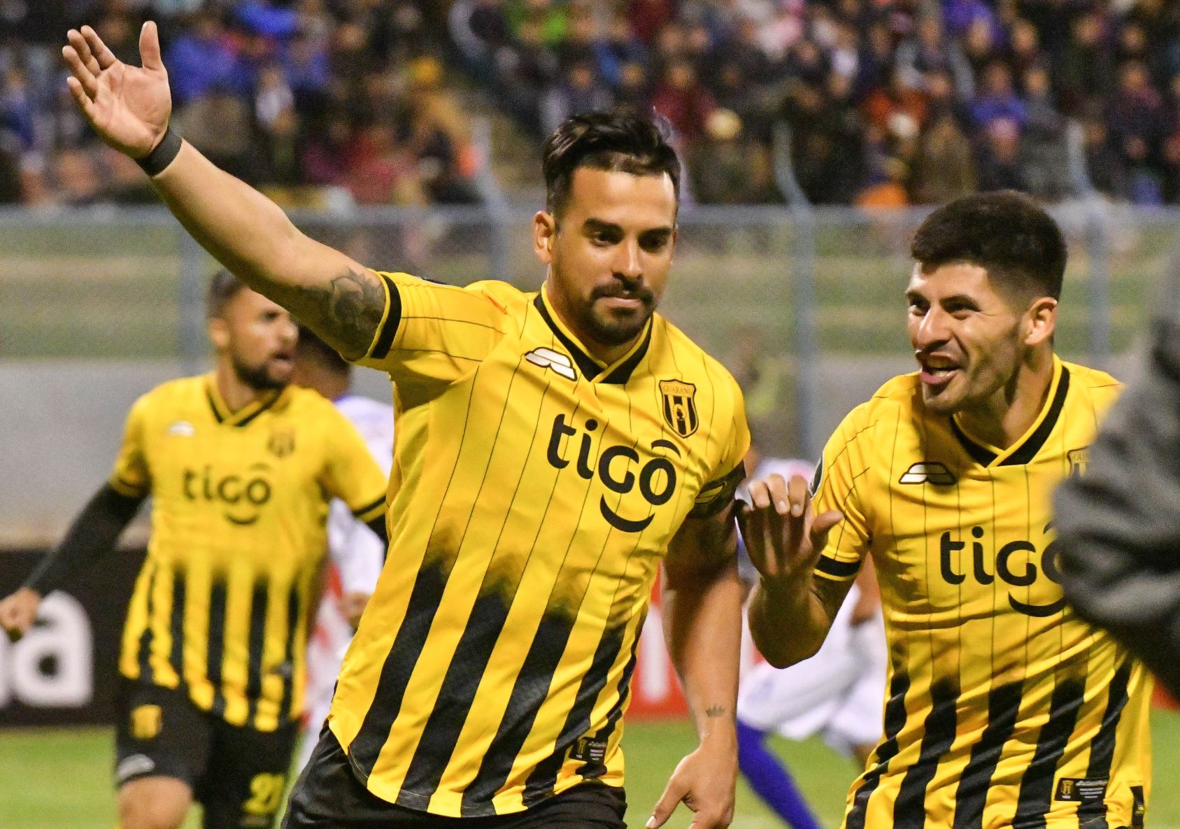 Cristian Baez (i) de Guaraní festeja tras anotar un gol ante San José este miércoles en un partido de la primera ronda de la Copa Libertadores entre San José de Bolivia y Guaraní de Paraguay, en el estadio Jesús Bermúdez en la ciudad de Oruro (Bolivia). EFE/Emilio Huascar