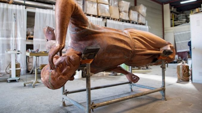 Recostada en una estructura metálica, la estatua está aún medio abierta y luce en su interior en una armadura metálica nueva y lustrosa.