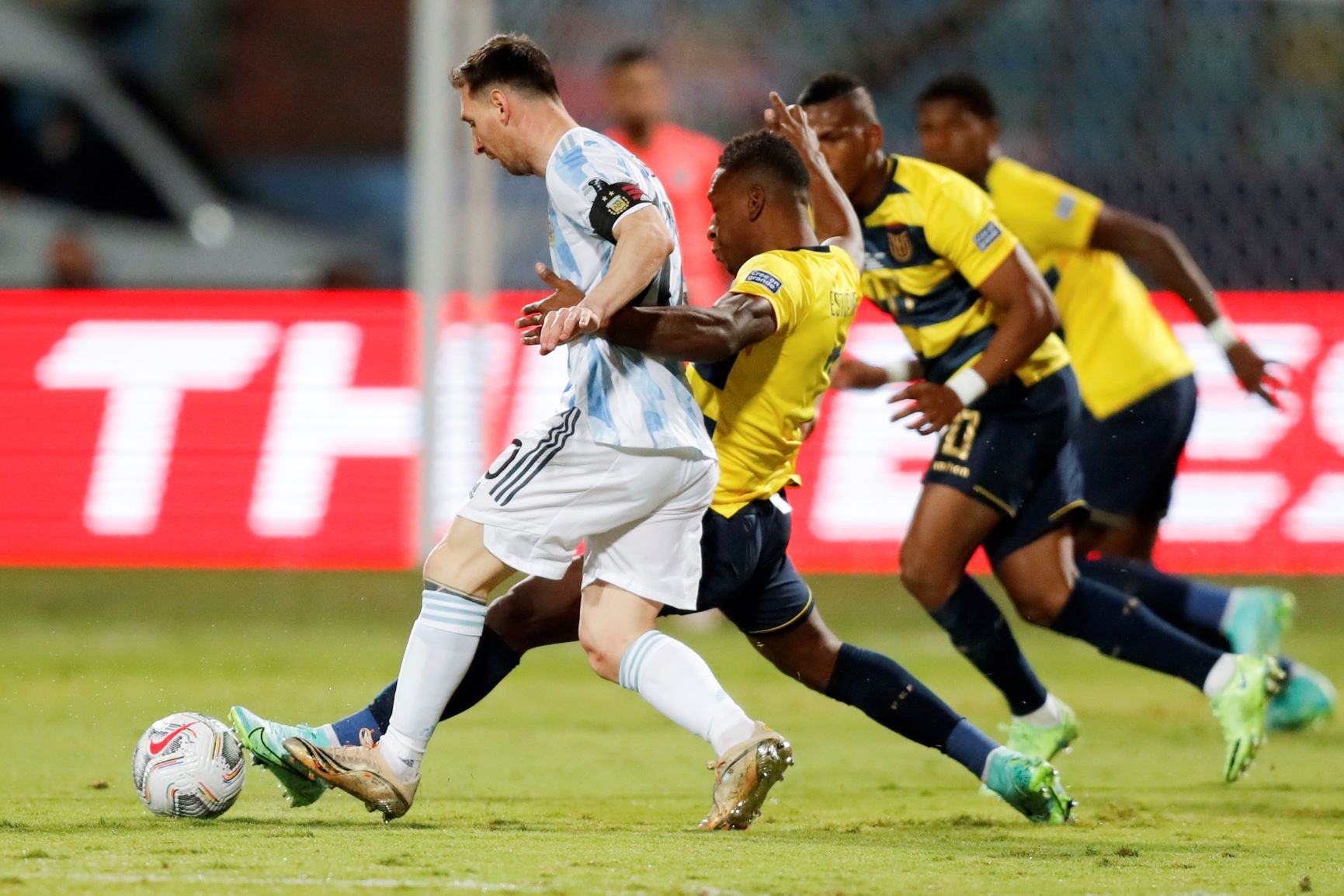 Lionel Messi (i) de Argentina en acción hoy contra Ecuador, durante un partido por los cuartos de final de la Copa América en el estadio Olímpico Pedro Ludovico Teixeira en Goiania (Brasil). EFE/Fernando Bizerra Jr