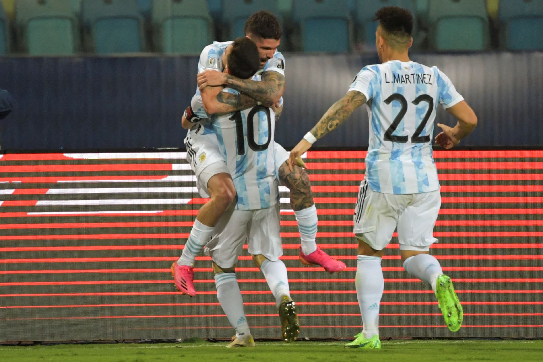 Rodrigo de Paul (i) de Argentina celebra un gol con Lionel Messi hoy ante Ecuador, durante un partido por los cuartos de final de la Copa América en el estadio Olímpico Pedro Ludovico Teixeira en Goiania (Brasil). EFE/Alberto Valdés