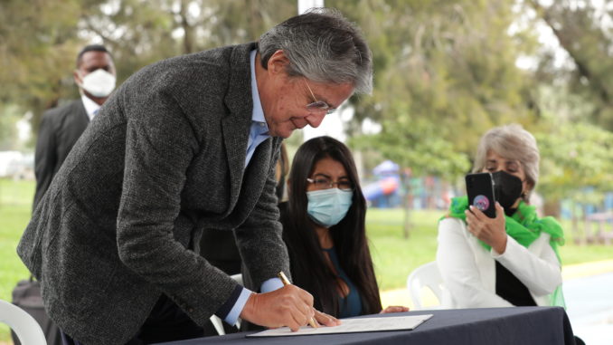 En un acto celebrado en el Parque de la Mujer en Quito, con motivo del 8M, y rodeado de ministras de su gabinete y mujeres de diferentes sectores sociales, el mandatario escenificó la firma del decreto junto a la secretaria de Derechos Humanos, Bernarda Ordóñez.