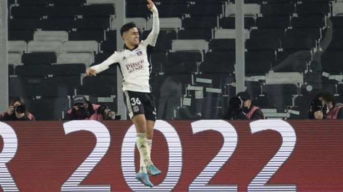 AME115. SANTIAGO (CHILE), 28/06/2022.- Pablo Solari de Colo Colo celebra hoy tras anotar contra Internacional, durante un partido por los octavos de final de la Copa Sudamericana en el estadio San Carlos de Apoquindo, en Santiago (Chile). EFE/Alberto Valdés