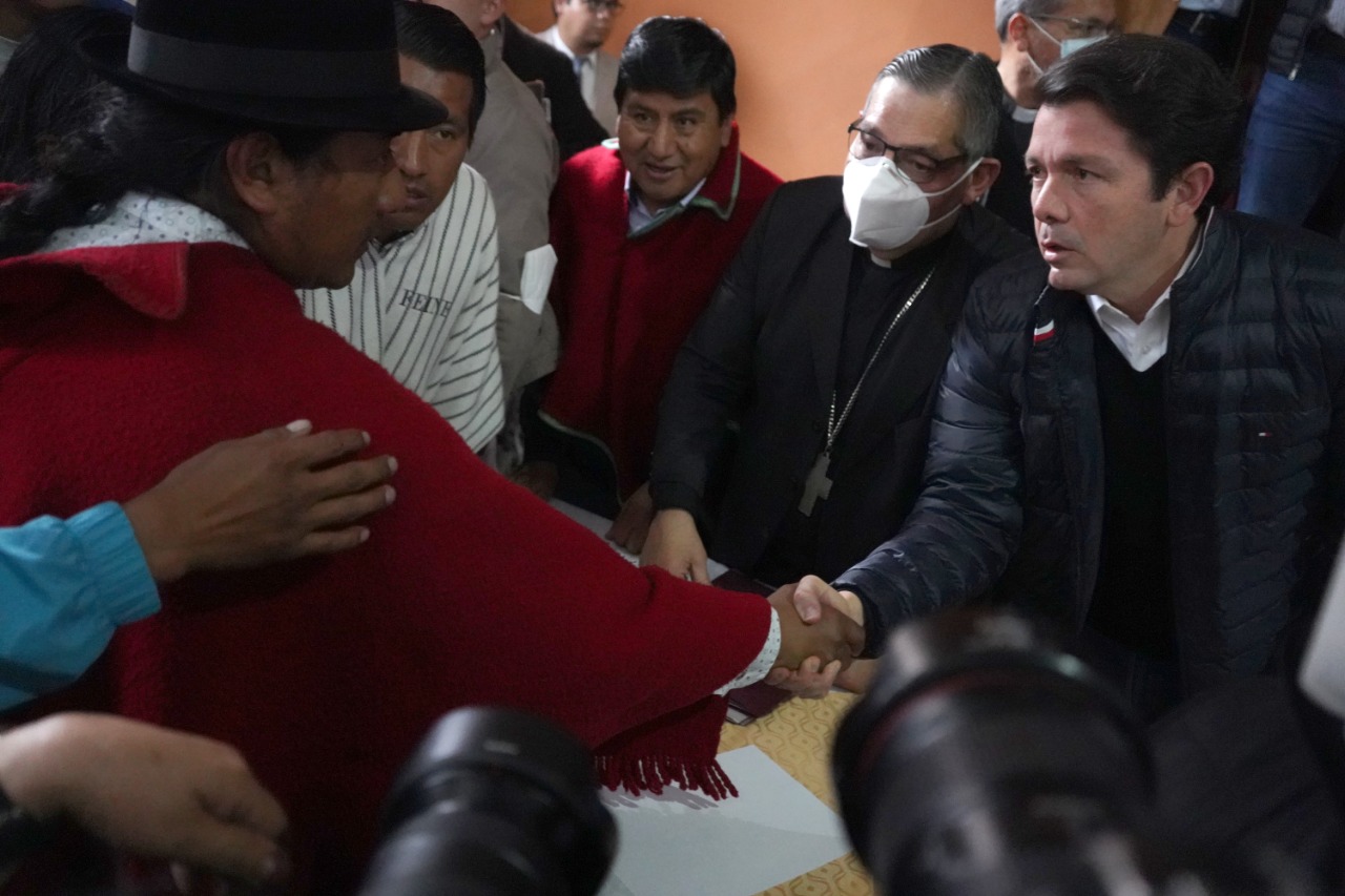 iza pancho apretón El presidente de la CONAIE, Leonidas Iza, y el ministro de Gobierno, Francisco Jiménez, tras firmar un acuerdo, el 30 de junio de 2022. API