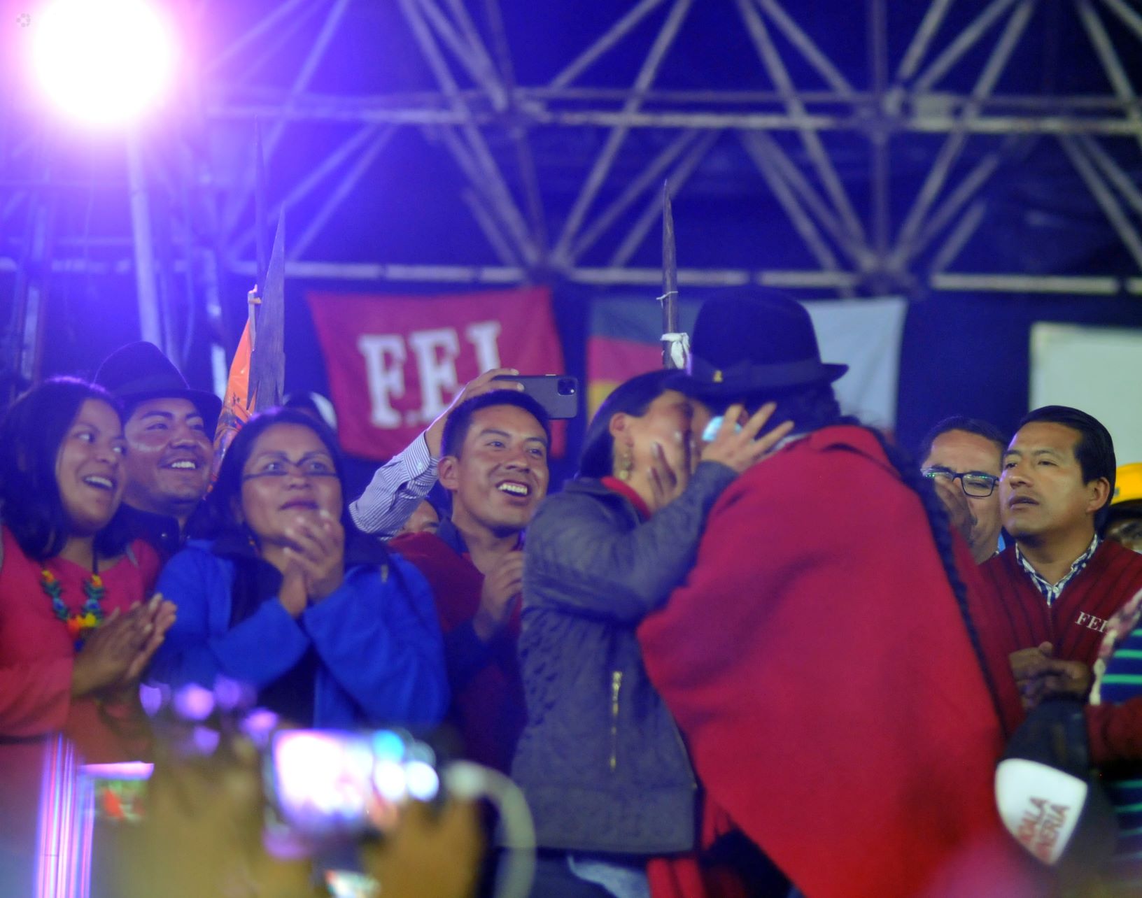 El presidente de la CONAIE celebra el acuerdo de paz firmado con el gobierno del Presidente Lasso, que da fin a 18 días de movilización nacional, el 30 de junio de 2022, en la Casa de la Cultura. API