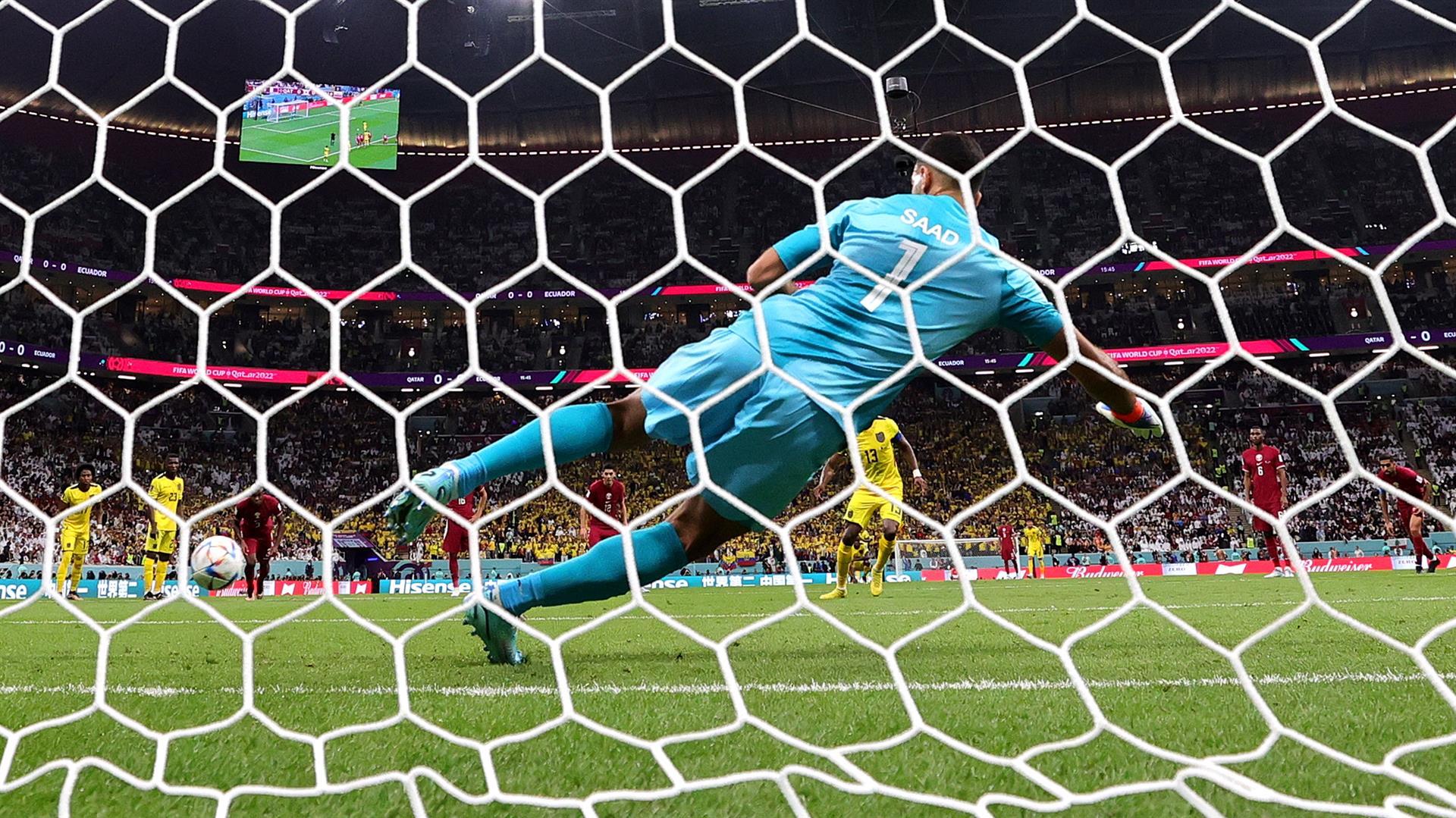 Enner Valencia (centro) de Ecuador vence al portero Saad Al-Sheeb de Qatar con un tiro penal para marcar el gol de apertura durante el partido inaugural del grupo A de la Copa Mundial de la FIFA 2022 entre Qatar y Ecuador en el estadio Al Bayt en Al Khor, Qatar, el 20 de noviembre. 2022. (Mundial de Fútbol, Catar) EFE/EPA/Friedemann Vogel