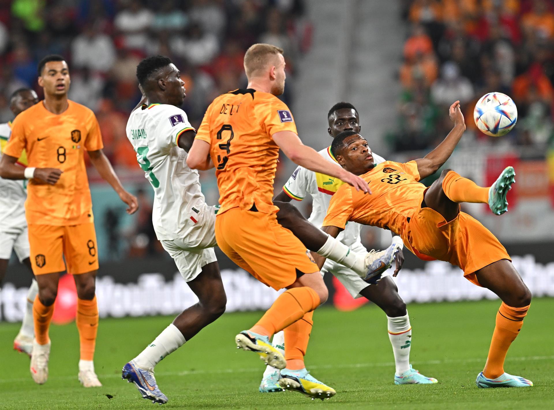 Denzel Dumfries (R) de los Países Bajos en acción durante el partido de fútbol del grupo A de la Copa Mundial de la FIFA 2022 entre Senegal y los Países Bajos en el Estadio Al Thumama en Doha, Qatar, el 21 de noviembre de 2022. (Mundial de Fútbol, Países Bajos; Holanda, Catar) EFE/EPA/Noushad Thekkayil