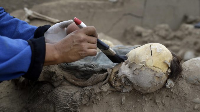 Arqueólogos trabajan en los restos de uno de los inmigrantes chinos del siglo XIX que fueron descubiertos en Lima, Perú, el jueves 24 de agosto de 2017. De acuerdo al ministerio de Cultura, las tumbas fueron localizadas en un sitio preinca porque aquellos cuerpos de inmigrantes de China no podían ser enterrados en cementerios católicos de la época. (AP Foto/Martin Mejia)