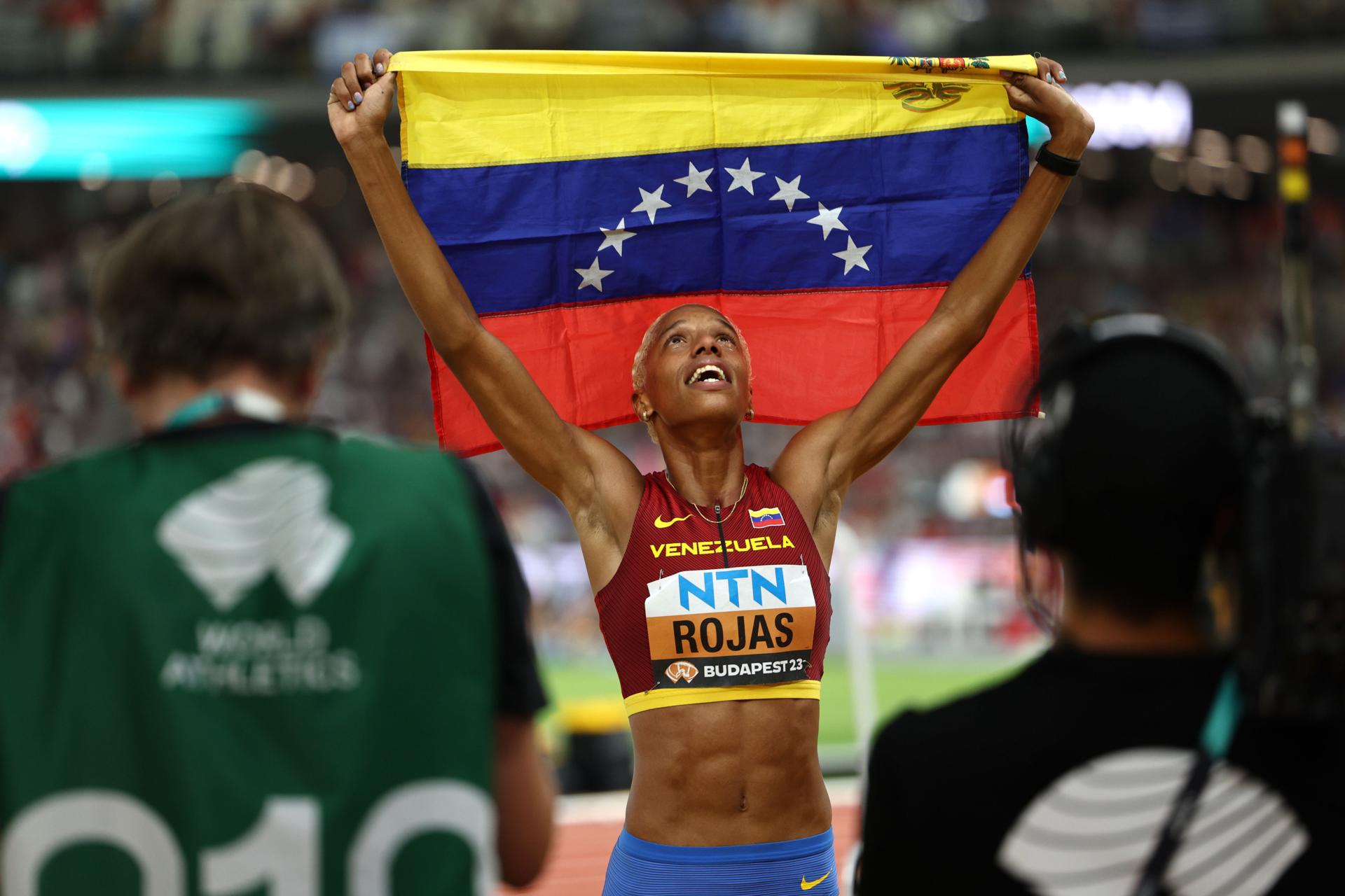 Yulimar Rojas de Venezuela celebra tras ganar la final de Triple Salto Femenino en el Campeonato Mundial de Atletismo, en Budapest, Hungría, 25 de agosto de 2023. (Mundial de Atletismo, Triple salto, Hungría) EFE /EPA/ANNA SZILAGYI