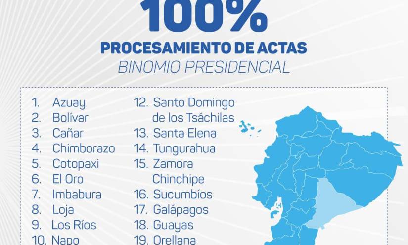 Con corte a las 19:30 del 18 de octubre, el Consejo Nacional Electoral (CNE) informó que el escrutinio de actas se ha completado al 100% en 23 provincias del país.