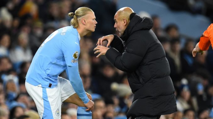 Manchester (Norway), 31/01/2024.- Manchester City's manager Pep Guardiola (R) gives instructions to Manchester City's Erling Haaland (L) before send him to replace Kevin De Bruyne (not pictured)during the English Premier League soccer match between Manchester City and Burnley FC, in Manchester, Britain, 31 January 2024. (Reino Unido) EFE/EPA/PETER POWELL EDITORIAL USE ONLY. No use with unauthorized audio, video, data, fixture lists, club/league logos, 'live' services or NFTs. Online in-match use limited to 120 images, no video emulation. No use in betting, games or single club/league/player publications.