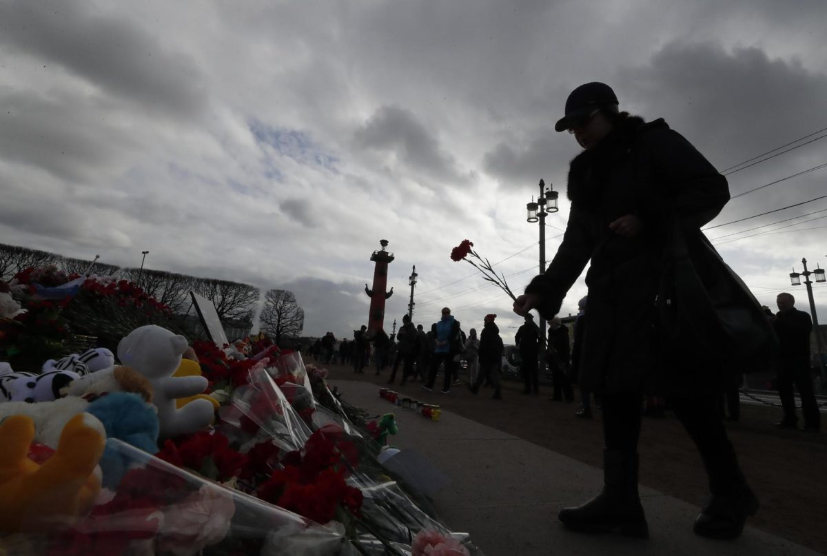 St. Petersburg (Russian Federation), 24/03/2024.- People mourn and lay flowers at a memorial in the city center, remembering the victims of the terrorist attack at the Crocus City Hall in the Moscow region, in St. Petersburg, Russia, 24 March 2024. On 24 March, Russia observed a day of national mourning for the victims of the terrorist attack in Krasnogorsk’s Crocus City Hall. At least 152 people were killed and more than 100 hospitalized after a group of gunmen attacked the concert hall in the Moscow region on 22 March evening, according to Russian authorities. Eleven suspects, including all four gunmen directly involved in the terrorist attack, have been detained, Russian officials said. (Terrorista, Atentado terrorista, Rusia, Moscú, San Petersburgo) EFE/EPA/ANATOLY MALTSEV