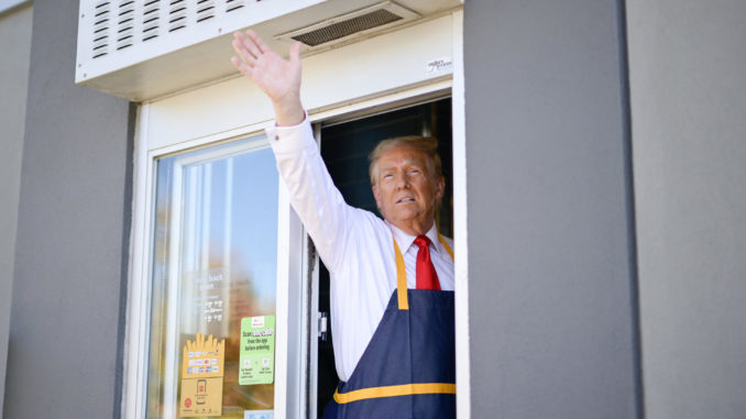 AME9226. FEASTERVILLE (ESTADOS UNIDOS), 20/10/2024.- Fotografía tomada de la cuenta en X del asesor de comunicación del candidato republicano a la Casa Blanca, el expresidente (2017-2021) Donald Trump, Dan Scavino Jr., donde se ve a Trump saludando desde un local de McDonald's en Feasterville (EE.UU.). Trump hizo campaña en un local de McDonald's en el estado clave de Pensilvania, donde acusó a su rival demócrata, la vicepresidenta Kamala Harris, de haberse inventado que de joven trabajó para esta cadena de comida rápida. EFE/ @danscavino /SOLO USO EDITORIAL/ SOLO DISPONIBLE PARA ILUSTRAR LA NOTICIA QUE ACOMPAÑA (CRÉDITO OBLIGATORIO)