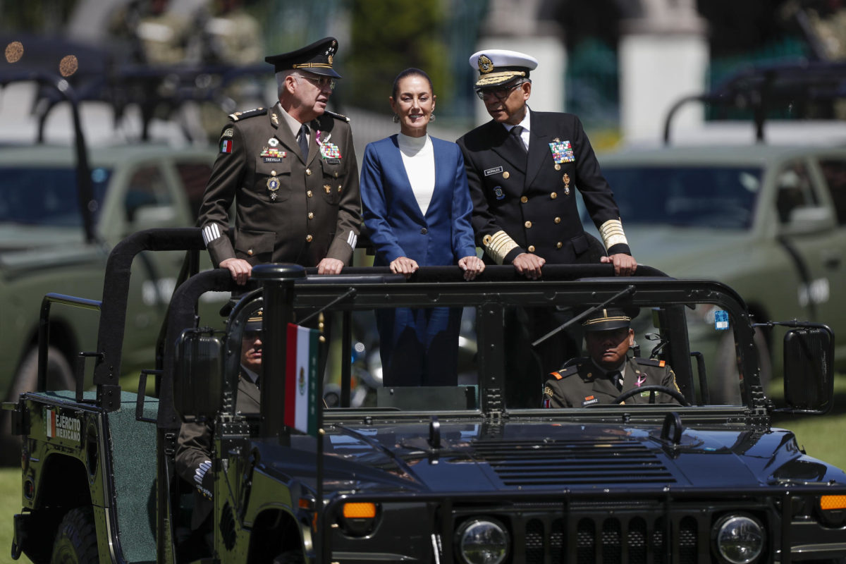 La presidenta de México, Claudia Sheinbaum (c), acompañada del secretario de la Defensa Nacional (Sedena), Ricardo Trevilla Trejo (i) y de Marina (Semar), Raymundo Pedro Morales (d), pasan revista durante la ceremonia de saludo a las Fuerzas Armadas y Guardia Nacional, este jueves en el Campo Marte de la Ciudad de México (México). Sheinbaum garantizó que durante su mandato las Fuerzas Armadas respetarán los derechos humanos, pese a que en la víspera se reveló que militares mataron a tiros a seis migrantes de Egipto, El Salvador y Perú en el sur del país. EFE/ Isaac Esquivel