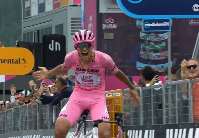 BORMIO (Italia), 28/05/2025.- El ciclista mexicano Isaac Del Toro Romero, del UAE Team Emirates XRG, con la camiseta rosa de líder de la general, celebra su victoria en la 17ª etapa del 108º Giro de Italia 2025, una carrera ciclista de 155 km entre San Michele all’Adige y Bormio, el 28 de mayo de 2025. (Ciclismo, Italia) EFE/EPA/LUCA ZENNARO
