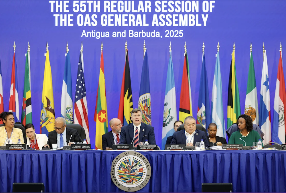 El secretario general de la Organización de los Estados Americanos (OEA), Albert Ramdin (2i), el subsecretario de Estado de Estados Unidos, Christopher Landau (c), y el asistente del secretario general de la OEA, Néstor Méndez, asisten a la primera sesión plenaria de la 55ª Asamblea General de la OEA este jueves, en Saint John’s (Antigua y Barbuda). (Foto Bienvenido Velasco de la agencia EFE)