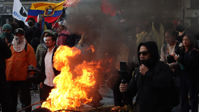 Los manifestantes iniciaron un plantón aproximadamente a las 15h00 en la Plaza Indoamérica para respaldar el paro nacional convocado por la CONAIE, que llega a su octava jornada en protesta por la eliminación del subsidio al diésel.