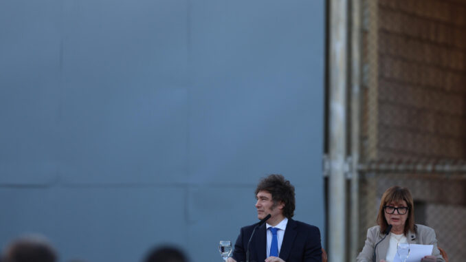 AME4509. EZEIZA (ARGENTINA), 02/10/2025.- El presidente de Argentina, Javier Milei (i), y la ministra de Seguridad, Patricia Bullrich, hablan durante un evento de Gobierno este jueves, en el Complejo Penitenciario Federal, en Ezeiza (Argentina). Milei anunció que impulsará una reforma del Código Penal que, entre otros aspectos, aumenta las penas para diversos tipos de delitos y baja la edad de imputabilidad de los 16 a los 13 años. EFE/ STR