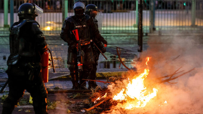 AME3860. QUITO (ECUADOR), 30/09/2025.- Policías se enfrentan con manifestantes durante una protesta contra el presidente de Ecuador, Daniel Noboa, por el alza del diésel y en apoyo a los manifestantes indígenas de la provincia de Imbabura, este martes en Quito (Ecuador). EFE/ José Jácome