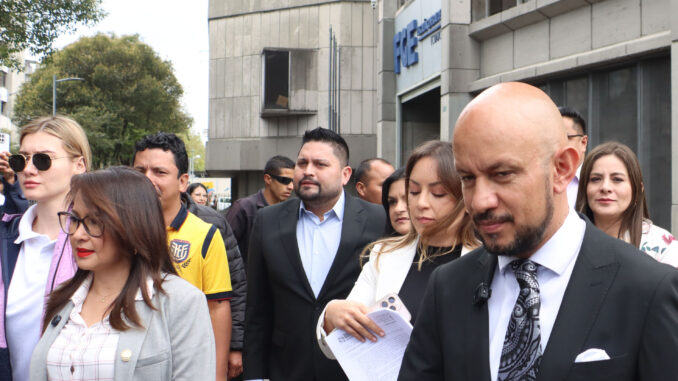 Quito, lunes 6 de octubre del 2025 Bancada de ADN, acudió a la Fiscalía General del Estado, para poner una denuncia por terrorismo en contra del Presidente de la Conaie Marlon Vargas. Mishel Mancheno y Andrés Castillo Fotos : API / Rolando Enríquez